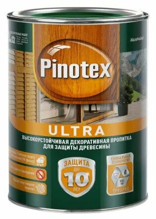 Пинотекс Ультра является хорошим средством для надежной защиты древесины снаружи от плесени, синевы, грибков гнили, негативного воздействия воды, солнца и ветра и привлекательно смотрится на стенах домов, заборах, беседках, хозпостройках и других наружных деревянных конструкциях. Пинотекс Ультра не допускается использовать для обработки внутренних поверхностей. Пинотекс Ультра содержит специальный УФ-фильтр, который придает поверхности большую стойкость к выгоранию. Пинотекс Ультра впитывается в древесину и не образует сплошной пленки.