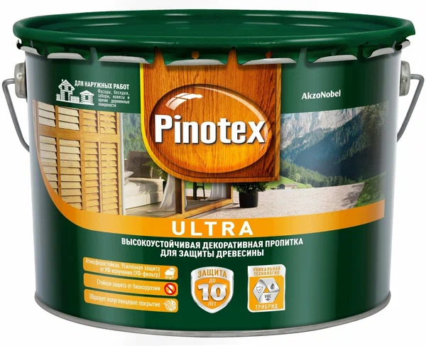 Пинотекс Ультра является хорошим средством для надежной защиты древесины снаружи от плесени, синевы, грибков гнили, негативного воздействия воды, солнца и ветра и привлекательно смотрится на стенах домов, заборах, беседках, хозпостройках и других наружных деревянных конструкциях. Пинотекс Ультра не допускается использовать для обработки внутренних поверхностей. Пинотекс Ультра содержит специальный УФ-фильтр, который придает поверхности большую стойкость к выгоранию. Пинотекс Ультра впитывается в древесину и не образует сплошной пленки.
