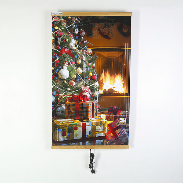 Обогреватель изготовлен из пленки с фотопечатью, и вы легко сможете выбрать подходящее изображение. Пленка закреплена с помощью двух деревянных планок, с крючком для крепления сверху.