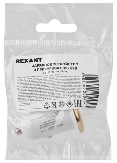 - Автозарядка в прикуриватель USB (АЗУ) (5 V, 1000 mA) белая REXANT