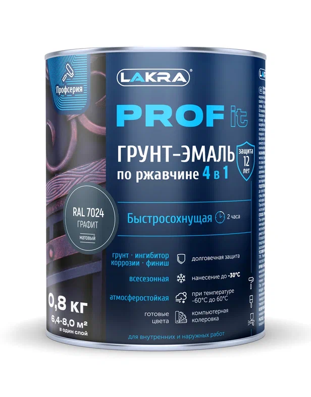 Грунт-эмаль по ржавчине Лакра PROF IT 4в1 быстросохнущая -30С, графит 0,8кг RAL7024