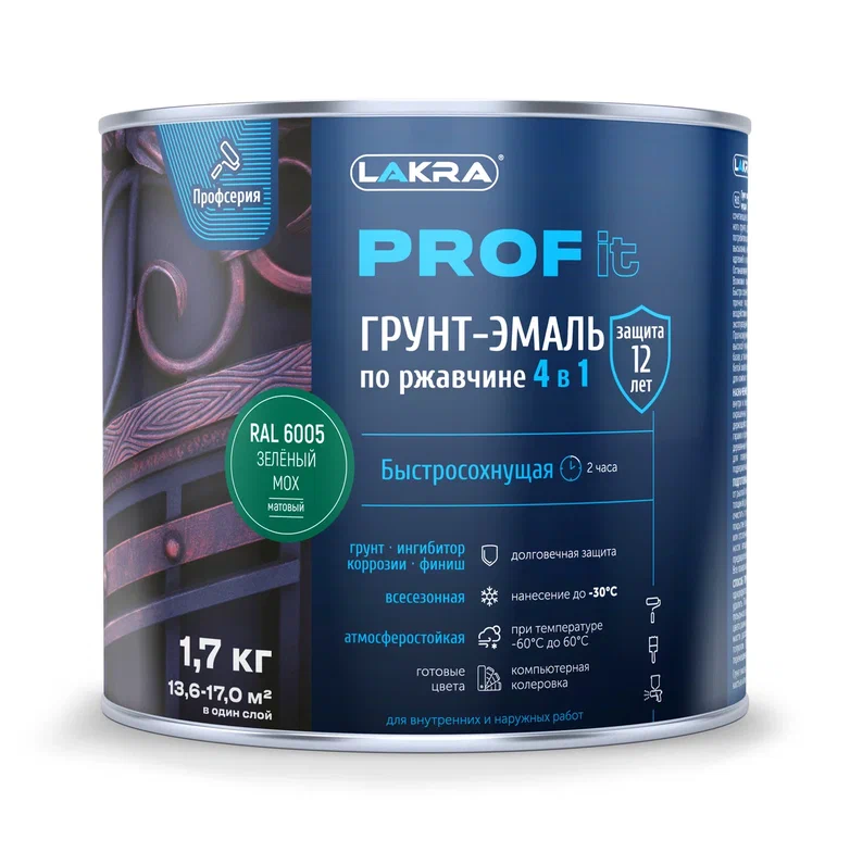 Грунт-эмаль по ржавчине Лакра PROF IT 4в1 быстросохнущая -30С, зеленый мох 1,7кг RAL6005