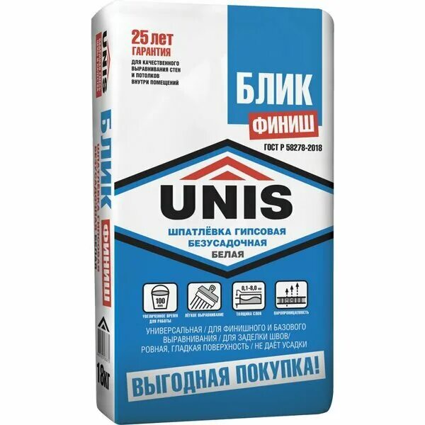 - безусадочность, трещиностойкость, высокие адгезионные показатели гипсовой шпатлевки «Блик» гарантируют долговременное сохранение качества получаемой поверхности и увеличивают срок службы наносимых в дальнейшем материалов