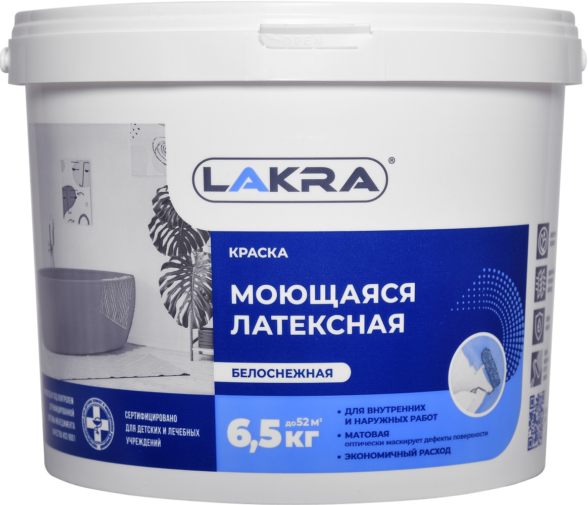 Краска ЛАКРА моющаяся латексная белоснежная 6,5кг